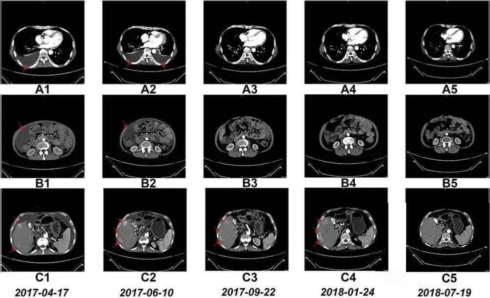 令患者本人和医疗团队都格外惊喜的是,7个月后,患者的胸水和腹水明显减少,治疗17个月后,CT扫描显示他肝右叶的多个肿瘤显著缩小。淋巴细胞亚群出现的变化表明免疫功能得到改善。此外,患者的肝功能水平和白细胞、血小板、中性粒细胞和淋巴细胞计数也保持在参考范围内。